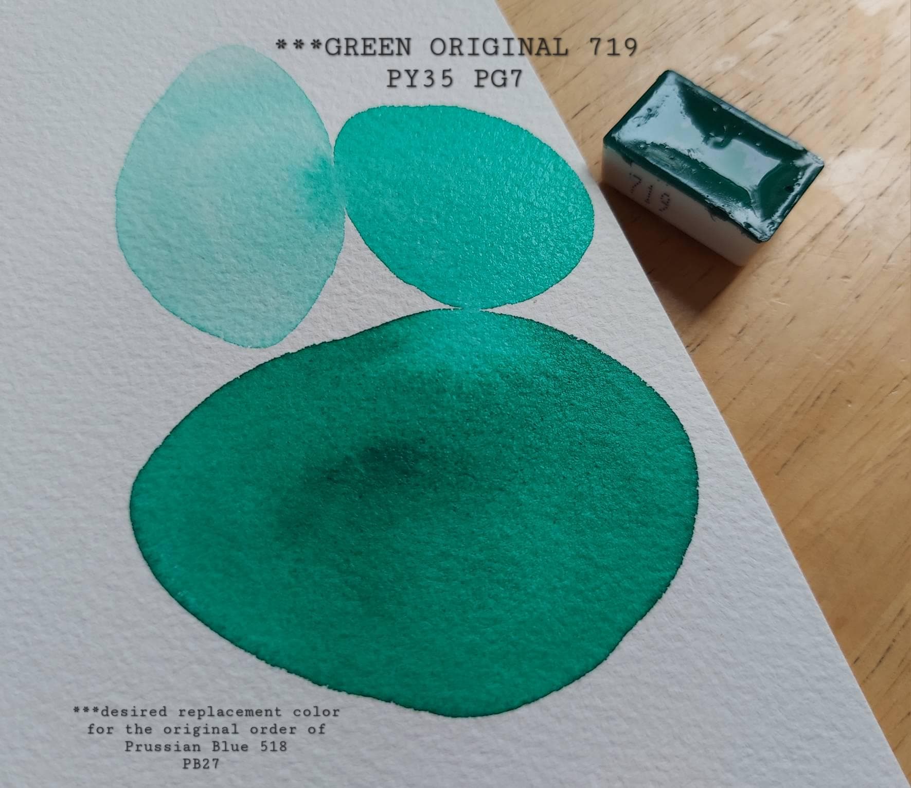 Prussian Blue PB27 is what I originally ordered. Unfortunately, it came defective from the factory and completely unusable. Upon knowing this, Serhii, the owner of ProArt, rapidly refunded me AND sent a replacement color of my choice! And so 719 Green Original PY35+PG7 is what I'm reviewing. I'm LOVE LOVE LOVE this color... I already own it! It creates very special Purples when mixed with their 368 Neon Pink PR122 and the ***ORIGINAL 325 Claret PR12. Now I have a full backup pan ready to go! So, a big THANK YOU to Serhii! He continues to offer a great selection of Nevskaya Palitra Watercolors at VERY affordable prices! This means a lot as an Artist on a tight budget. I highly recommend this shop! 👌 Cordially, Laura Isabel Gonzalez Art ***325 Claret is now a mix of PR179+PV55.